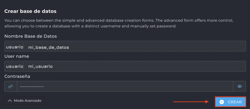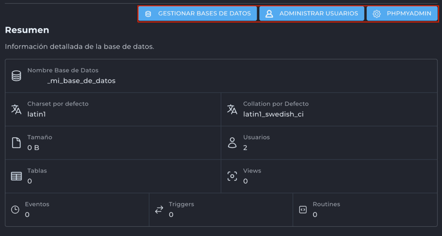- Dentro del administrador, selecciona la opción Crear nueva base de datos.